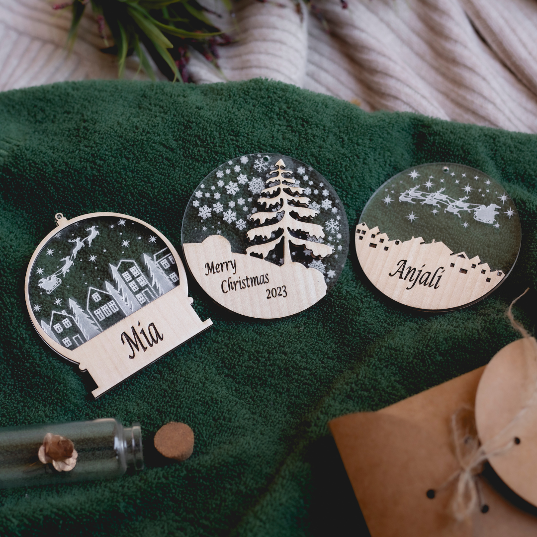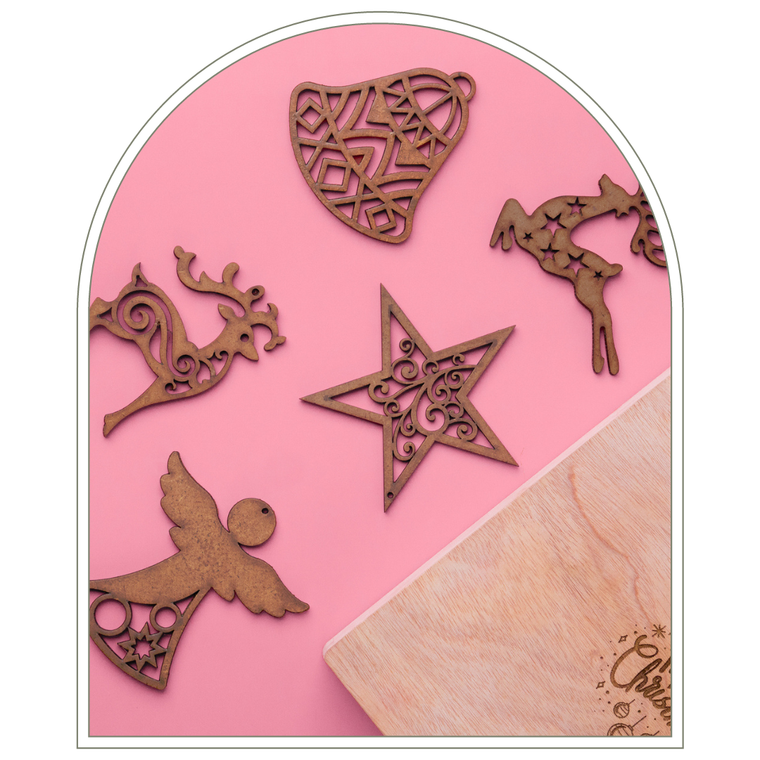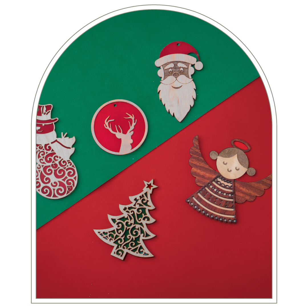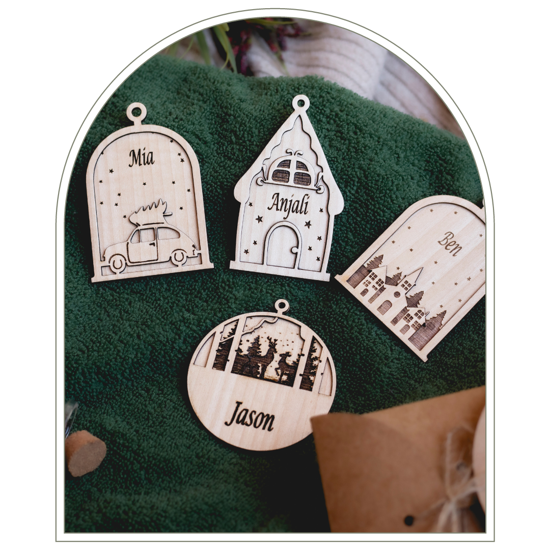 Enhance your holiday decor with our handcrafted wooden Christmas tree ornaments. Meticulously carved from quality wood, they evoke the warmth of the season with intricate detailing. These can be personalised with names on the ornaments.