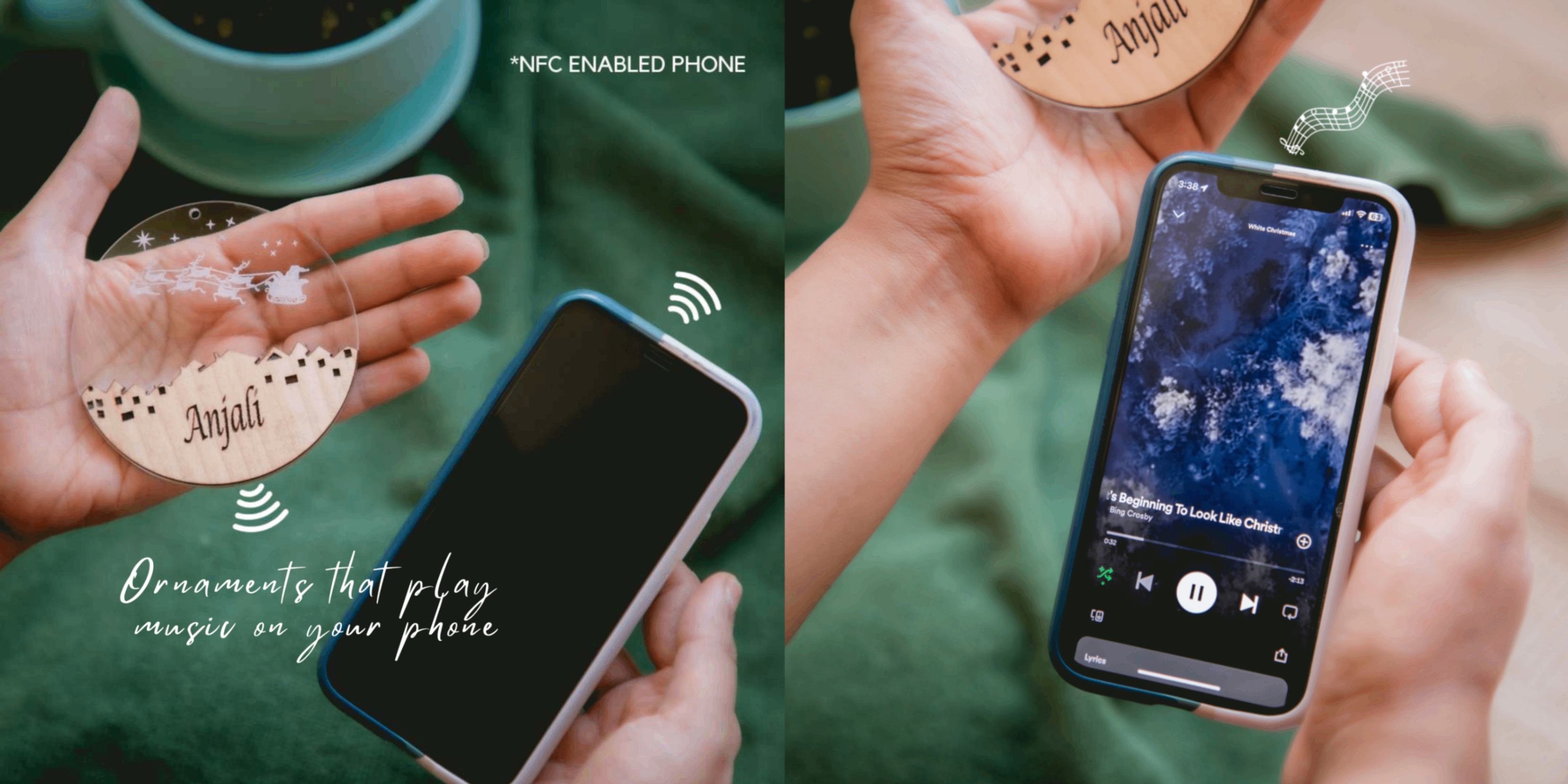 Buy Now!Enhance your holiday decor with our handcrafted wooden Christmas tree ornaments with personalisation of names and christmas tunes. Where Each ornament hides an NFC (Near Field Communication) chip.Scan it with your smartphone to play your favorite Christmas songs, blending tradition with modern magic.