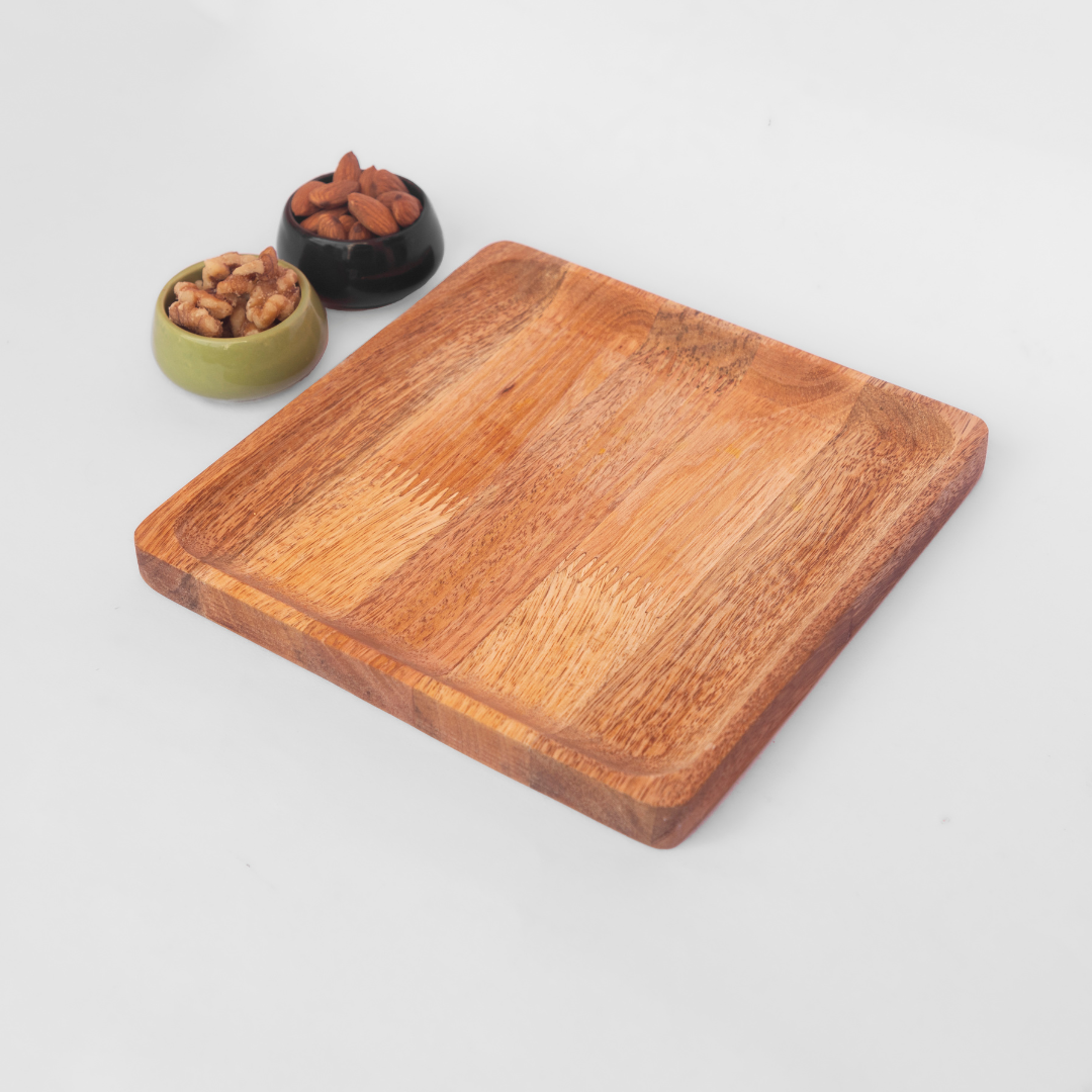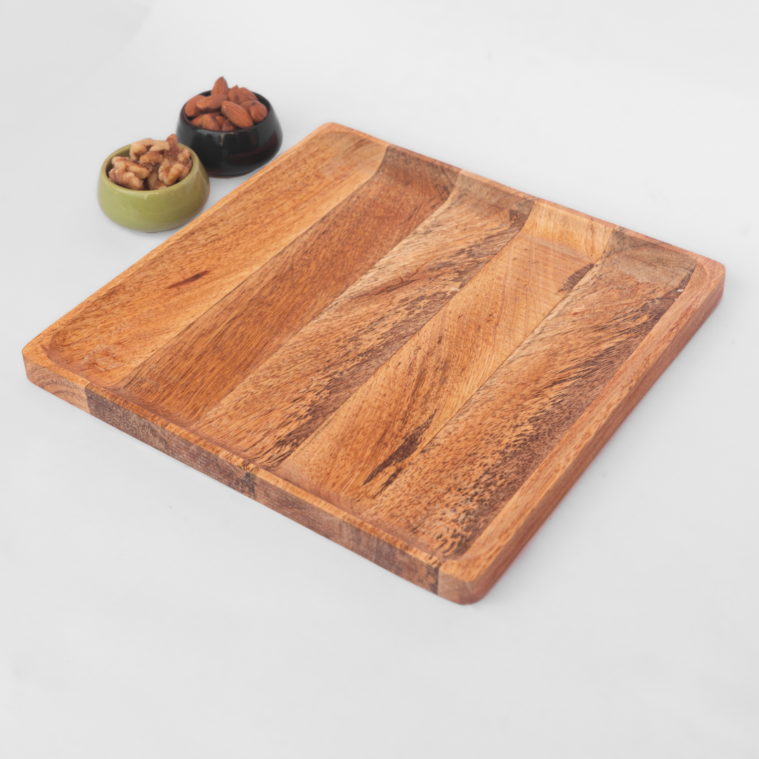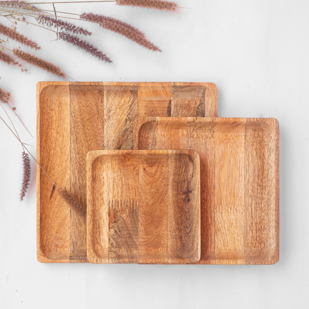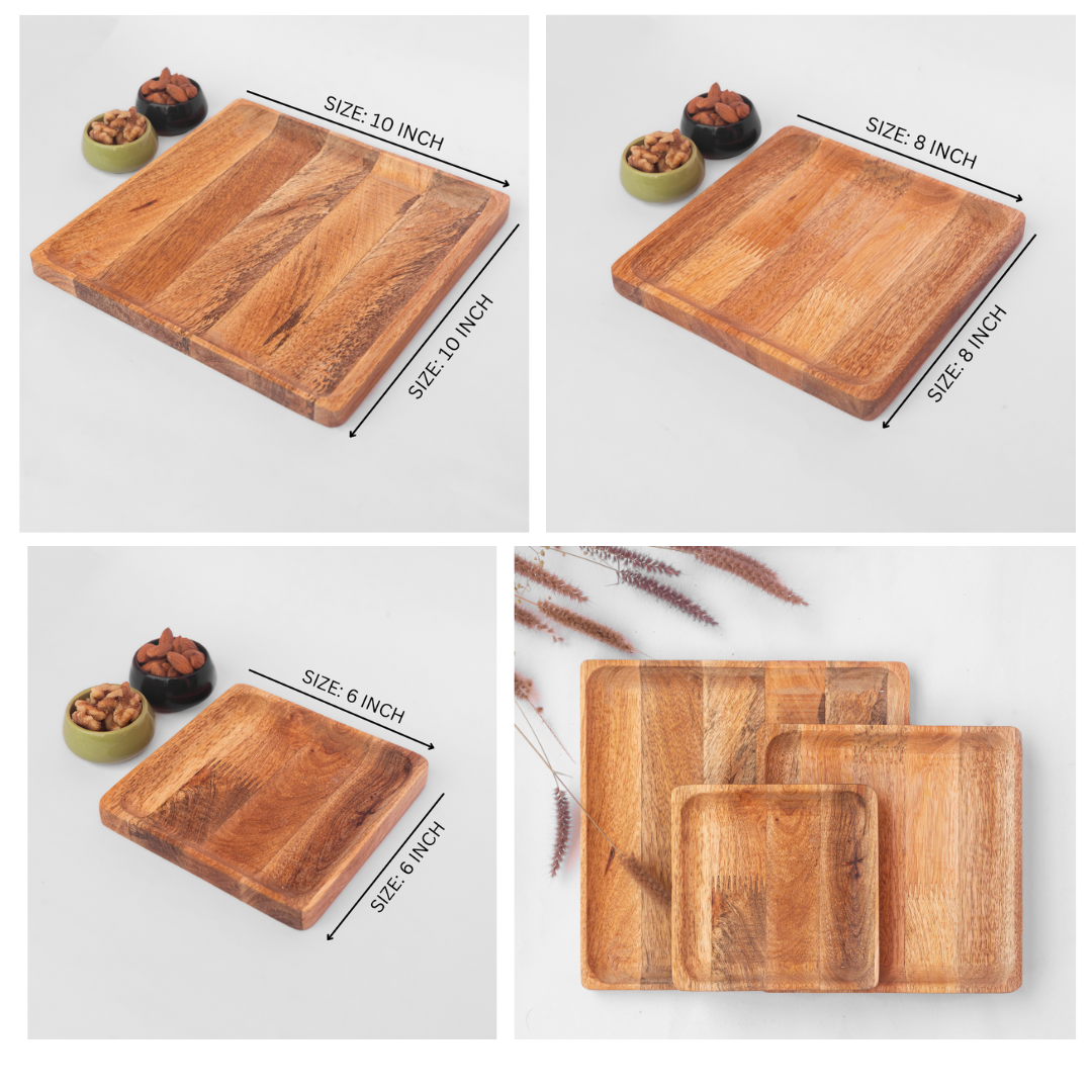 Introducing Our Aam Collection: A range of wooden serveware made using sustainably sourced mango wood that is sure to bring a rich earthy vibe to any gathering. Our Aam plates can be used to serve bread, croissants, snacks or any other snacks during movie nights, kitty parties or on game days. This combo contains 4 no's of 10" plates, 8" plates and 6" plates, totalling 12 plates in the set.