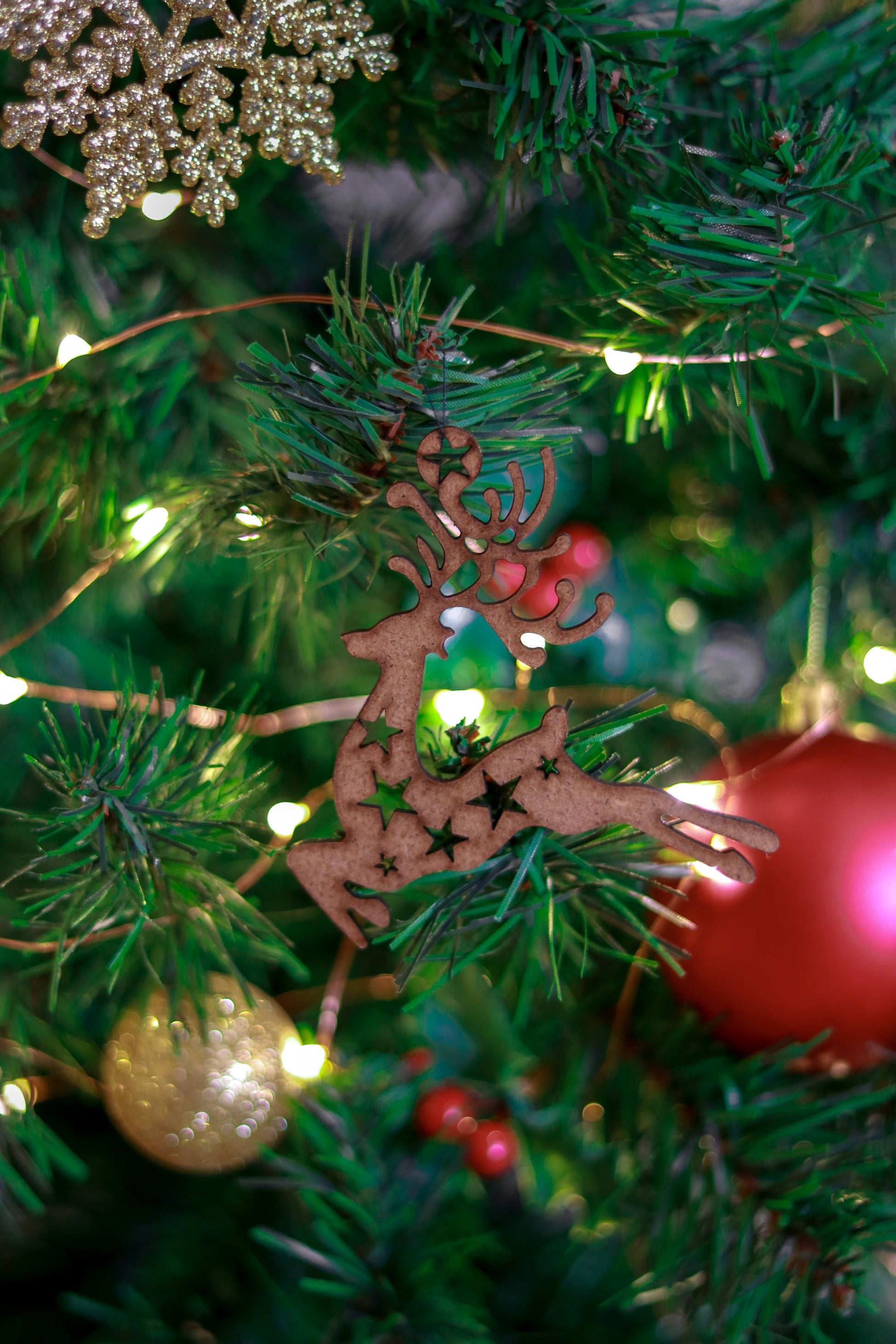 Ecofriendly Christmas tree ornaments manufactured from upcycled hardboard manufactured using wood pulp and paper waste. 100% biodegradable and sustainable. Has a very rustic wooden charm to it.