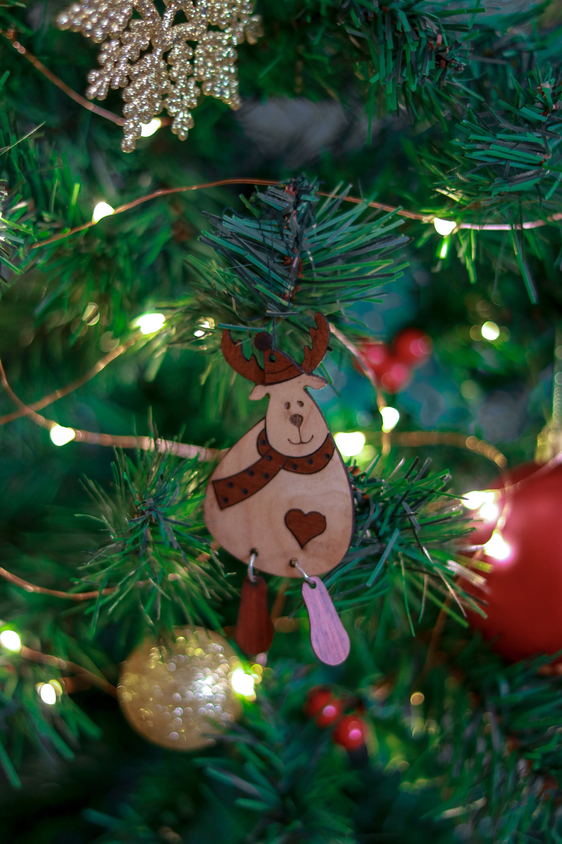 Ecofriendly Christmas tree ornaments manufactured using upcycled wood veneers such as padouk, mahogany, and birch. A quirky sustainable wooden decor alternative to traditional decor.