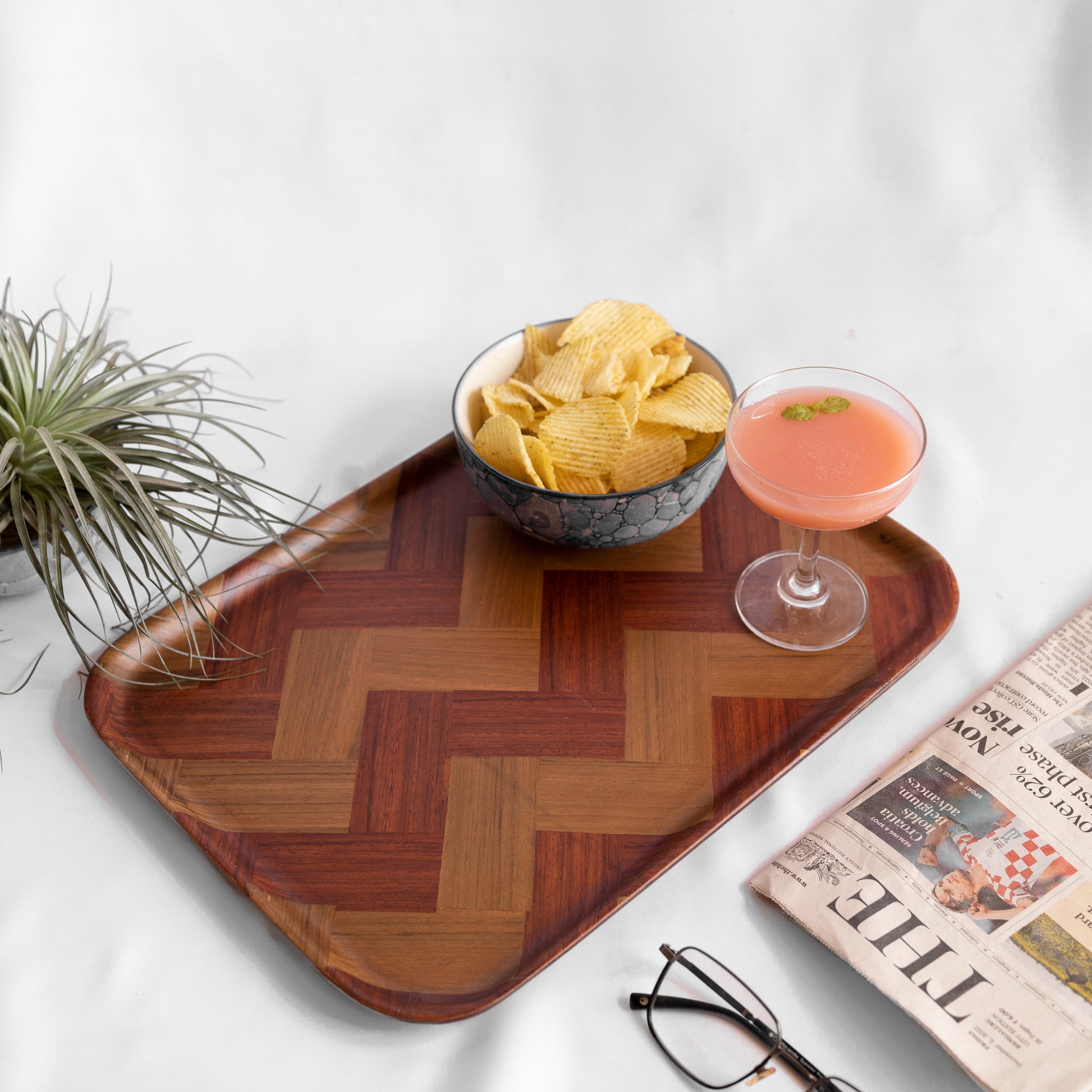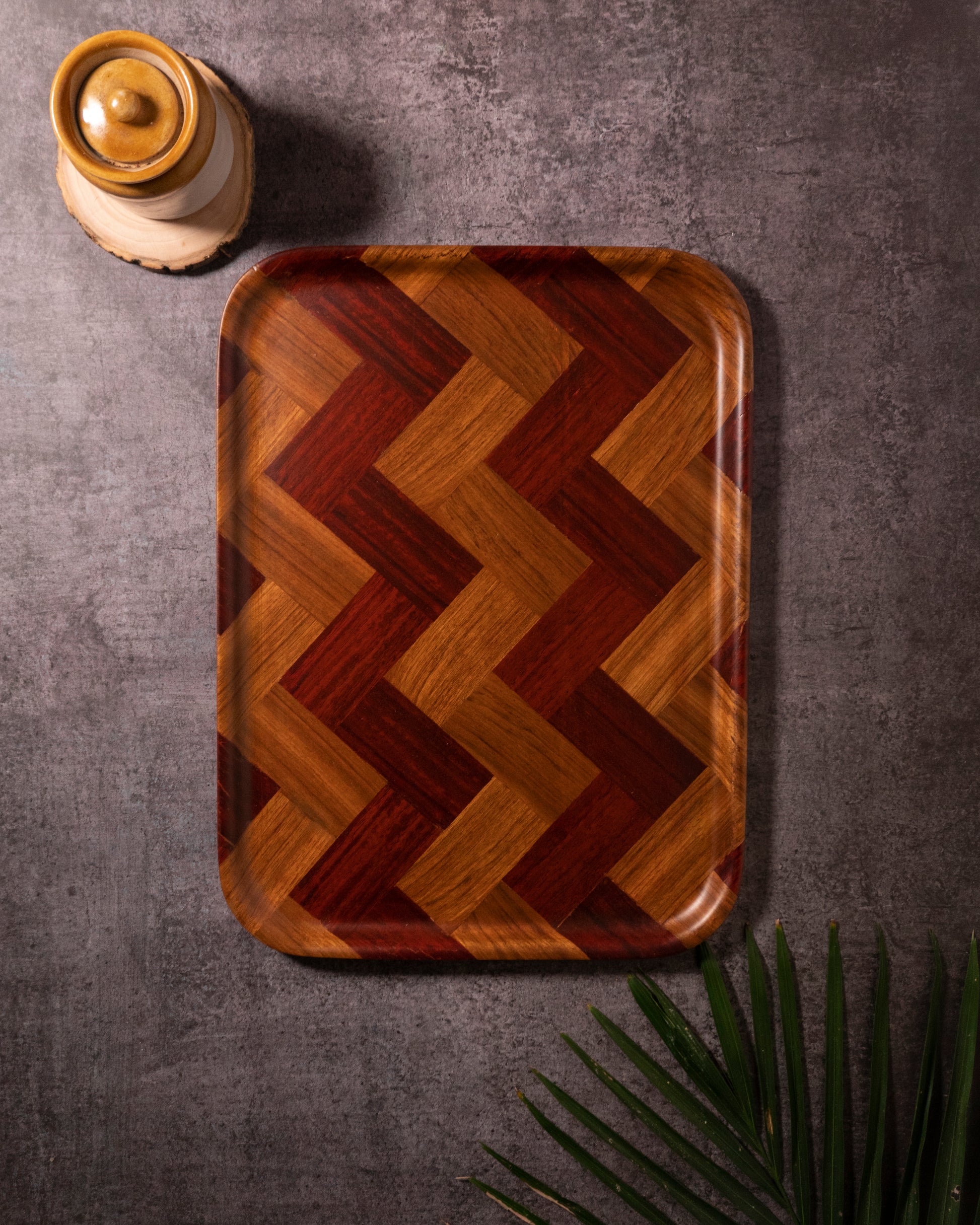 The Ember Rectangle Tray is a masterpiece of craftsmanship, crafted from luxurious teak wood and accented with rich padouk veneer. Its stunning handcrafted herringbone inlay design adds a touch of modern elegance, making it a standout piece for any space. Perfect for serving, organizing, or simply elevating your decor, this tray is a harmonious blend of artistry and functionality. A timeless addition to your home, the Ember Tray celebrates the beauty of natural materials and meticulous design..