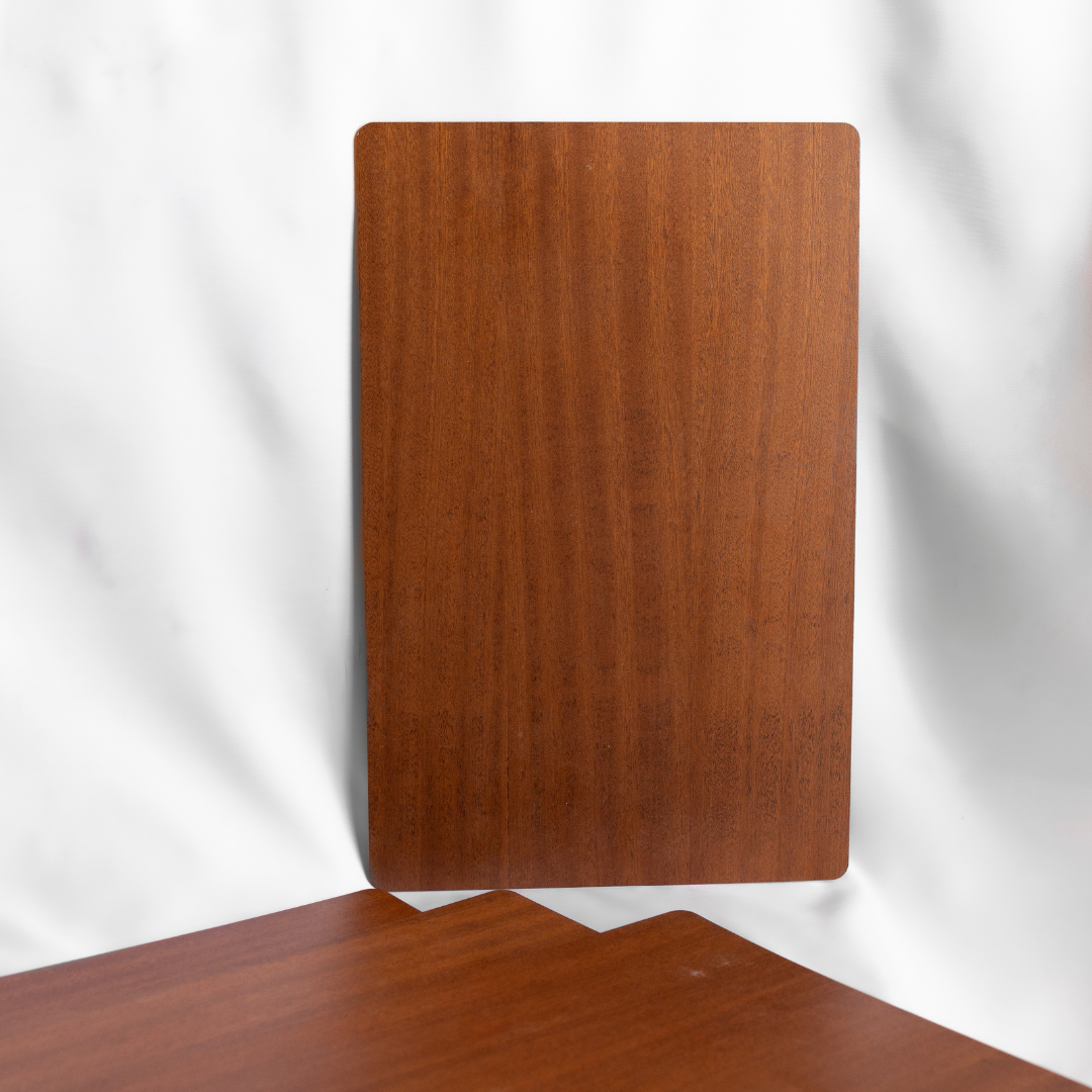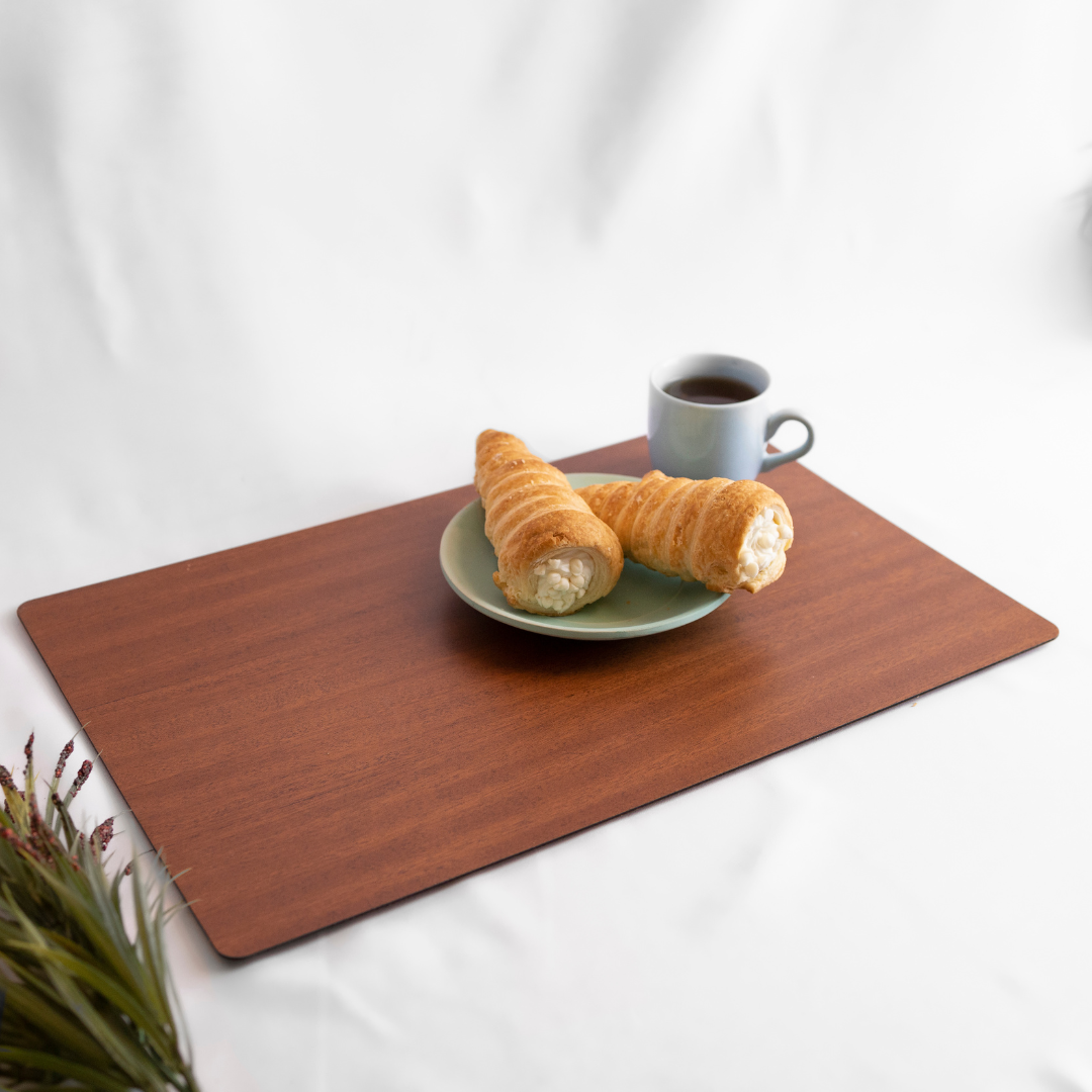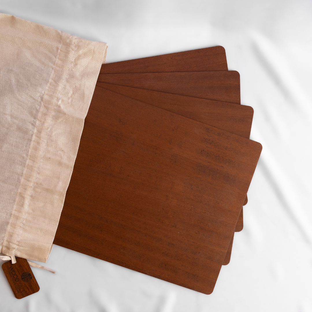 Wood Tales tablemats are made using a very unique material we call aircraft plywood made using natural Mahogany veneers. Because of this special material, our tablemats are very light weight for wooden tablemats yet sturdy. The tablemats have very low maintenance with only wiping with wet cloth required.