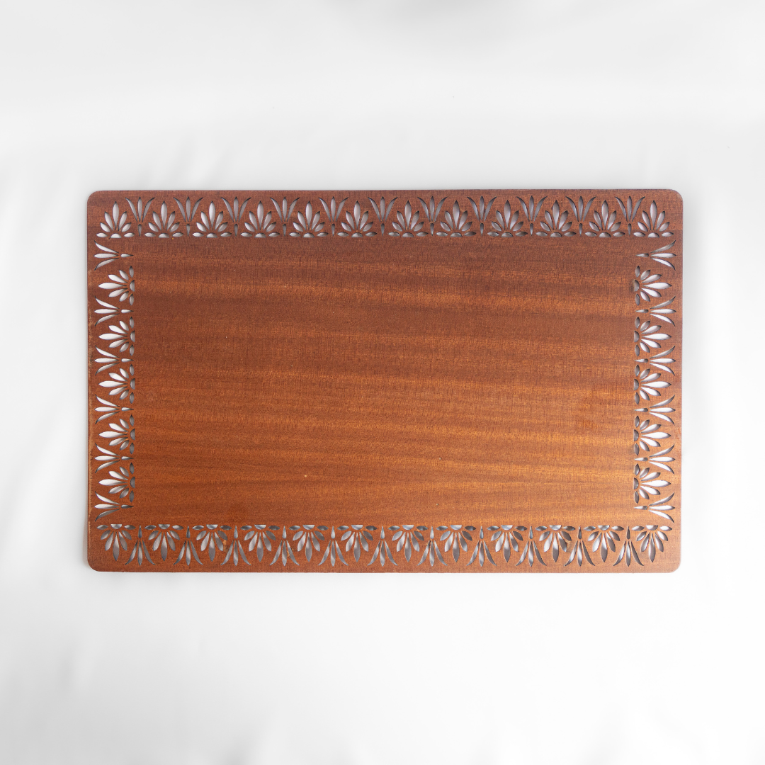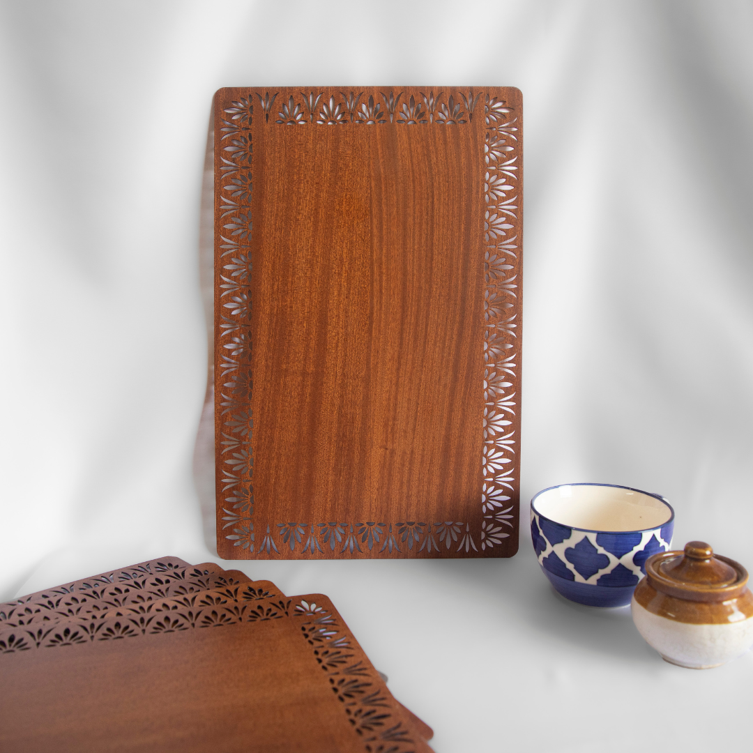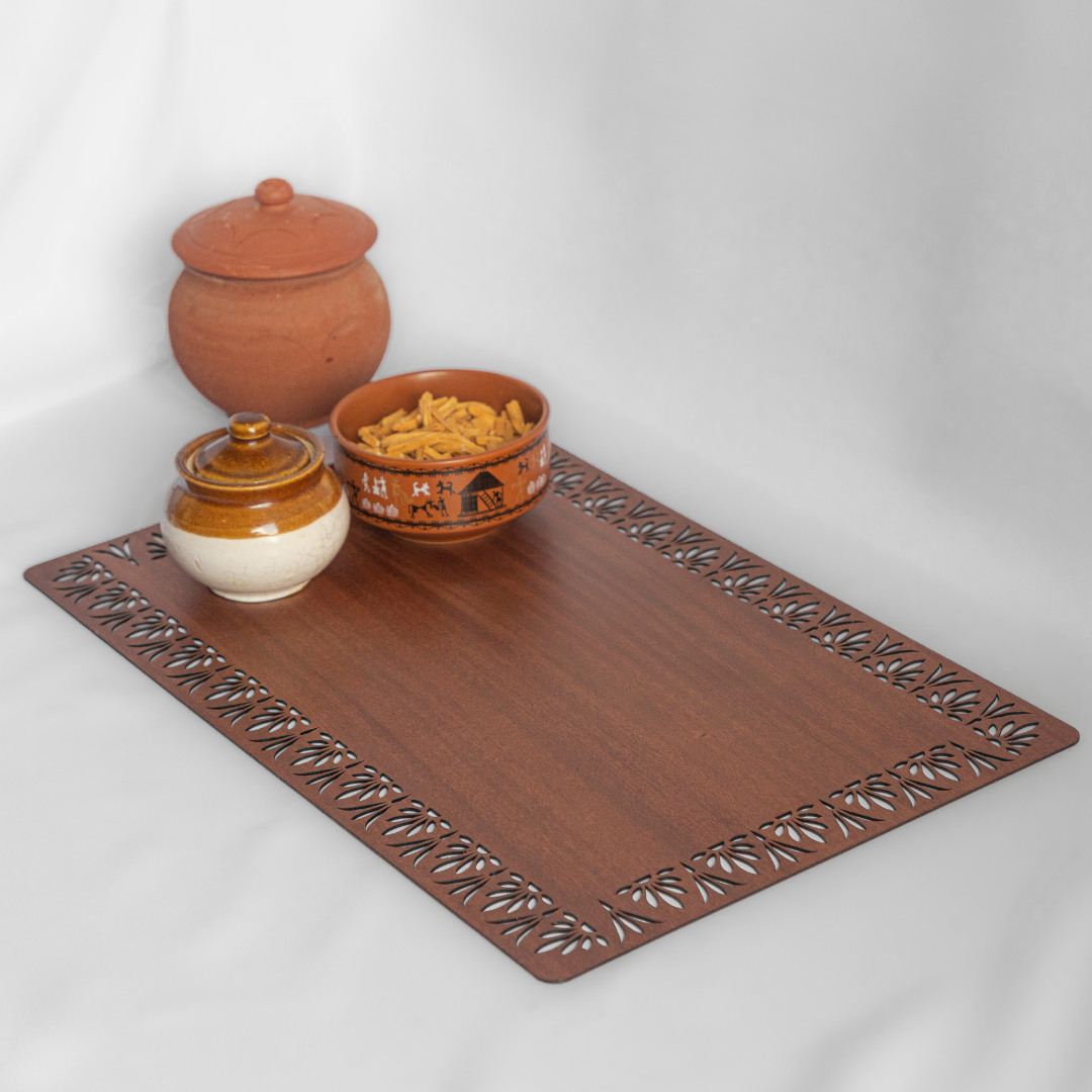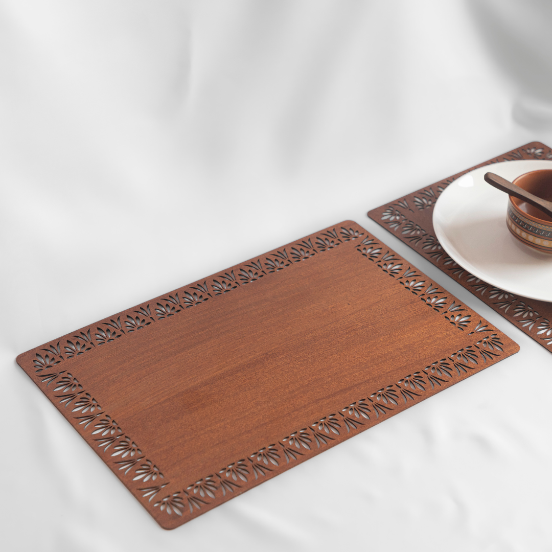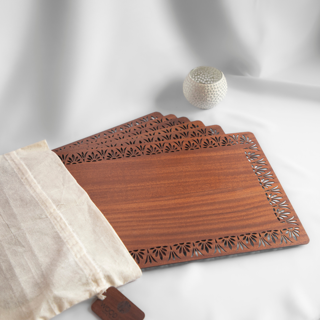 Wood Tales tablemats are made using a very unique material we call aircraft plywood made using natural Mahogany veneers. Because of this special material, our tablemats are very light weight for wooden tablemats yet sturdy. The tablemats have very low maintenance with only wiping with wet cloth required.