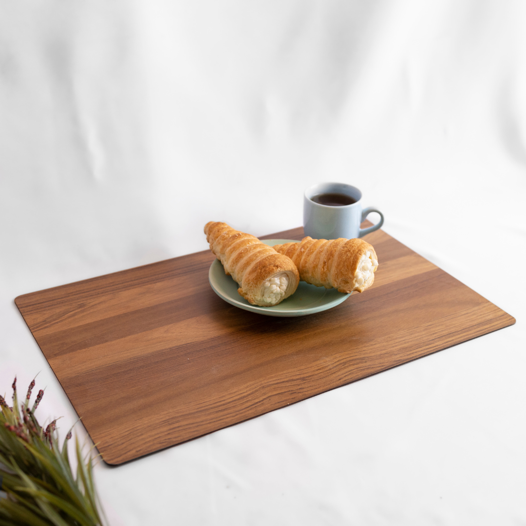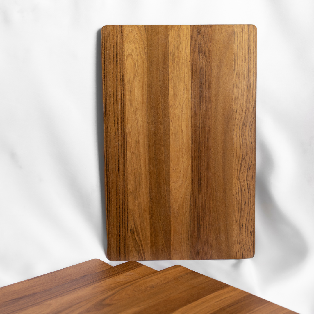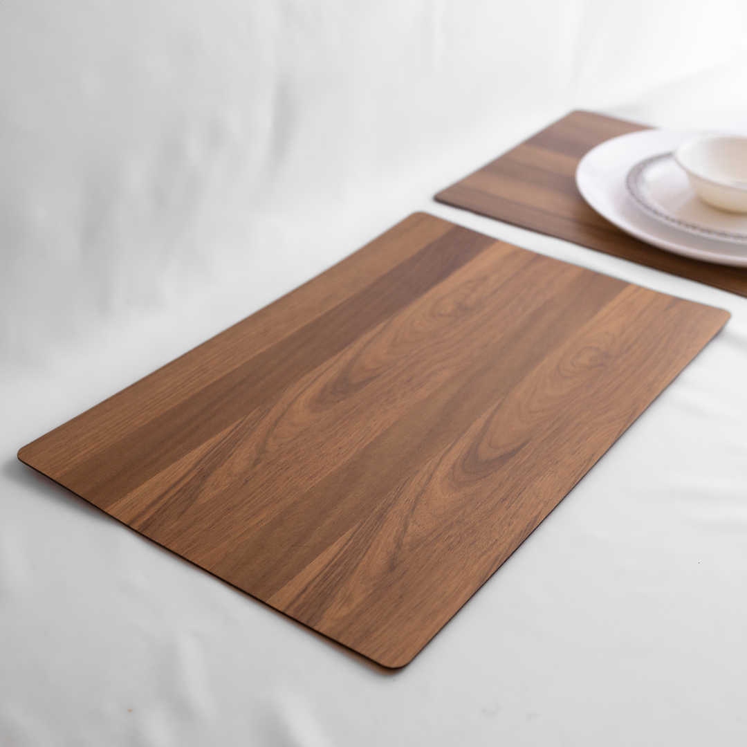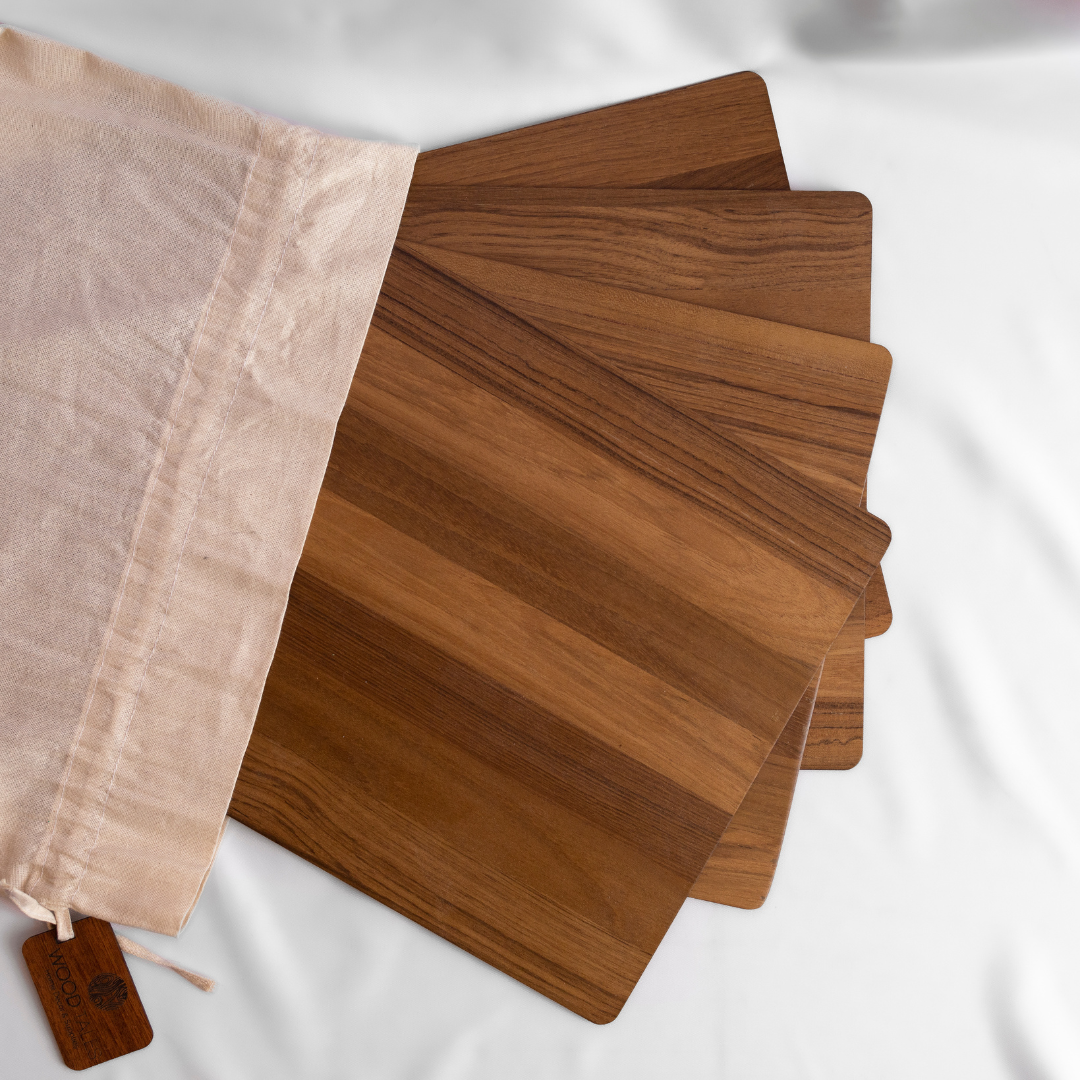 Wood Tales tablemats are made using a very unique material we call aircraft plywood made using natural Teak veneers. Because of this special material, our tablemats are very light weight for wooden tablemats yet sturdy. The tablemats have very low maintenance with only wiping with wet cloth required.