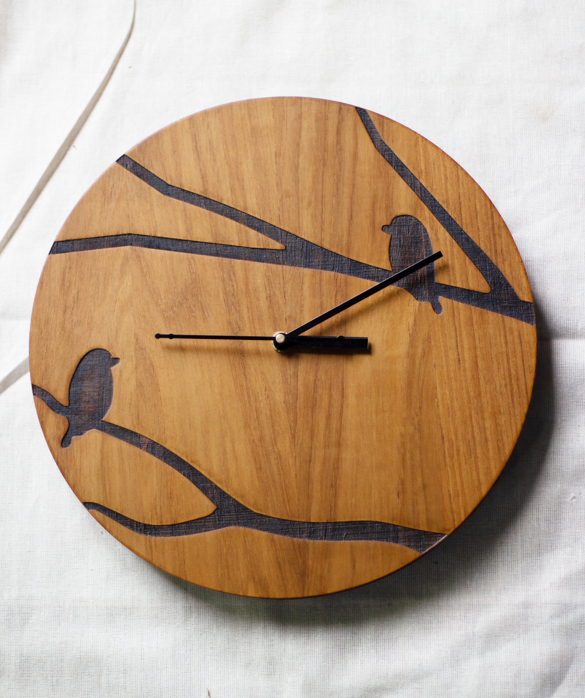 Round Bird engraved small Teak clock