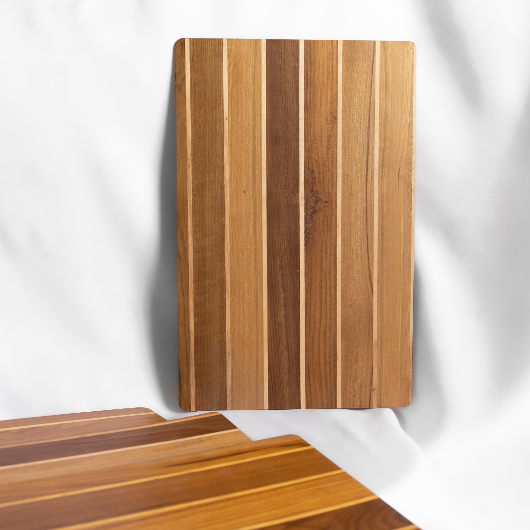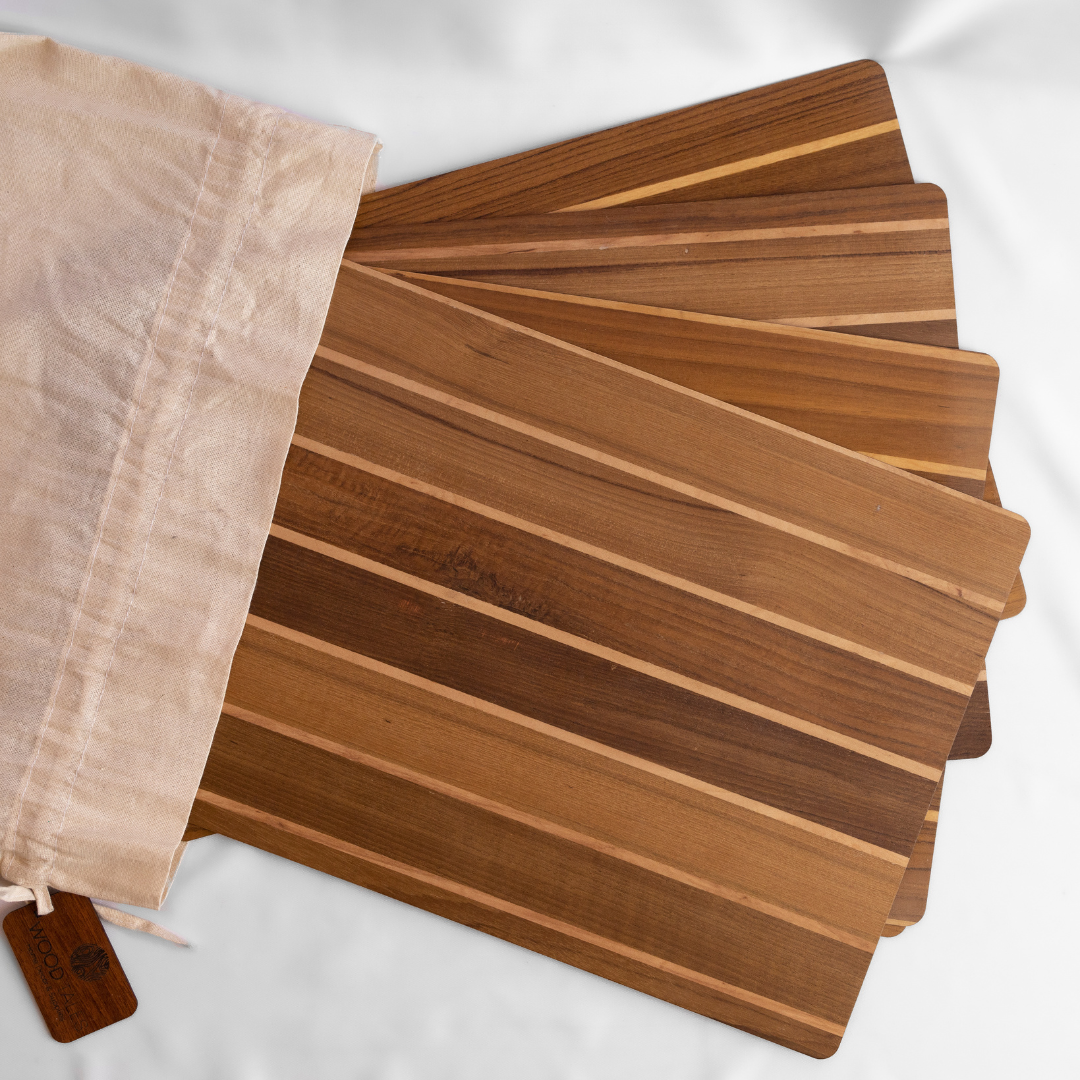 Wood Tales tablemats are made using a very unique material we call aircraft plywood made using natural Teak Deck veneers. Because of this special material, our tablemats are very light weight for wooden tablemats yet sturdy. The tablemats have very low maintenance with only wiping with wet cloth required.