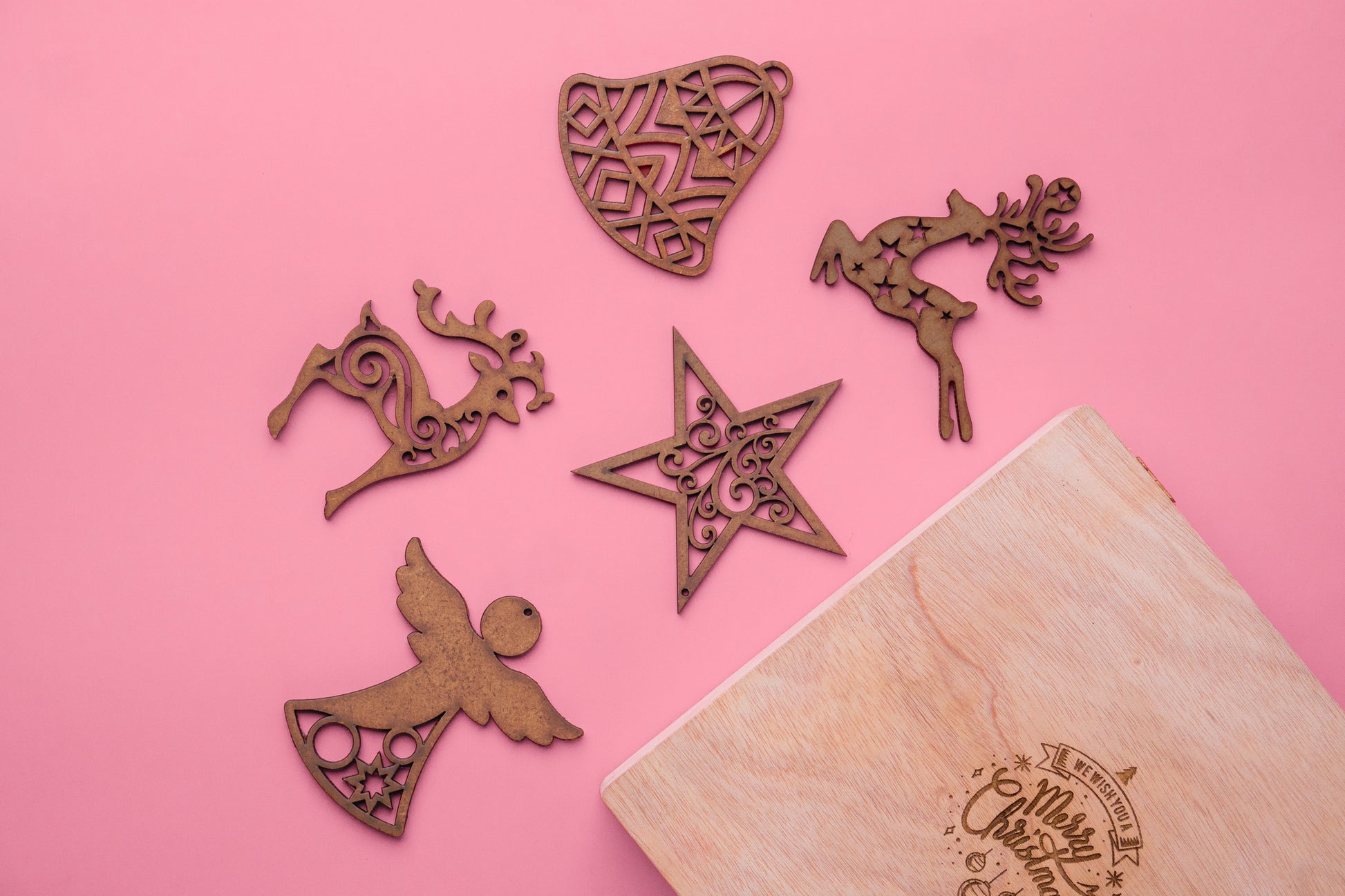 Ecofriendly Christmas tree ornaments manufactured from upcycled hardboard manufactured using wood pulp and paper waste. 100% biodegradable and sustainable. Has a very rustic wooden charm to it.