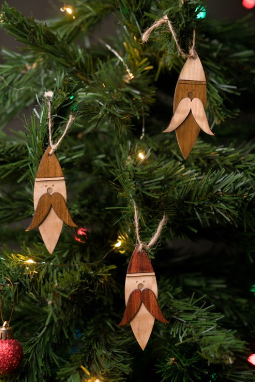 Ecofriendly Christmas tree ornaments manufactured from upcycled teak, padouk, birch, and mahogany. Comes as a set containing 3 ornaments of assorted wood combinations. A perfect Christmas gift for your loved ones.