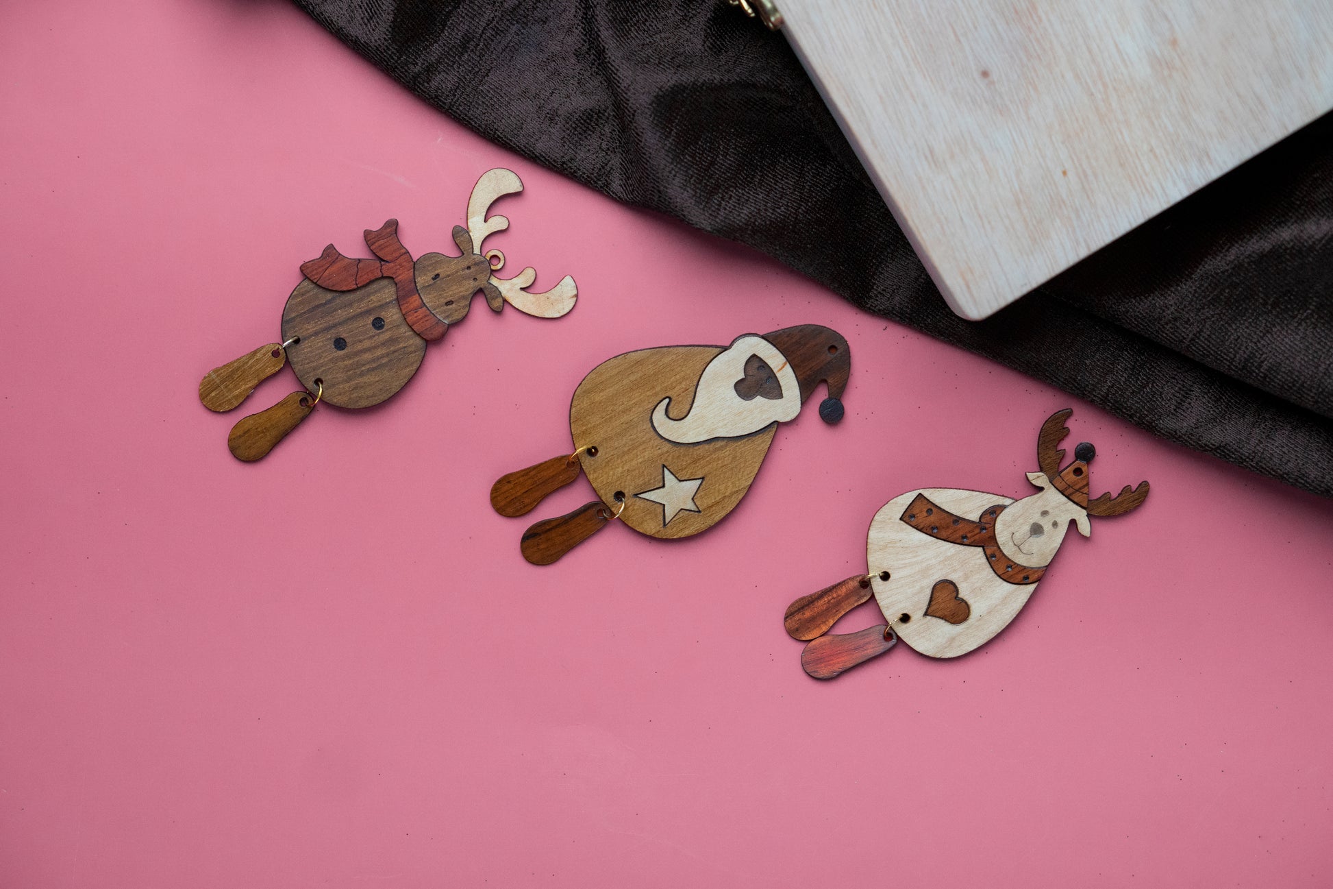 A set of 3 assorted design Christmas tree ornaments from the Wood Tales Christmas collection.